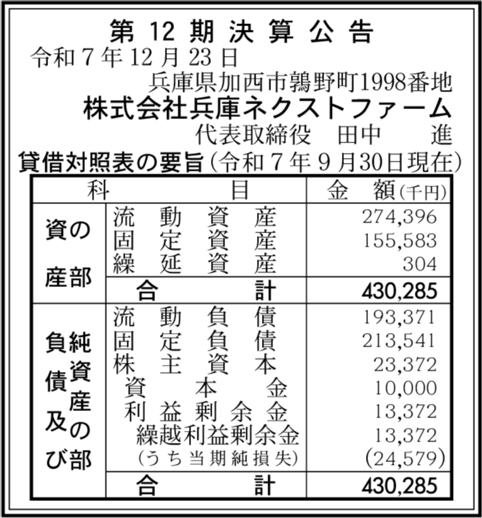 兵庫興産株式会社 兵庫県加西市 【2025年1月期】 |