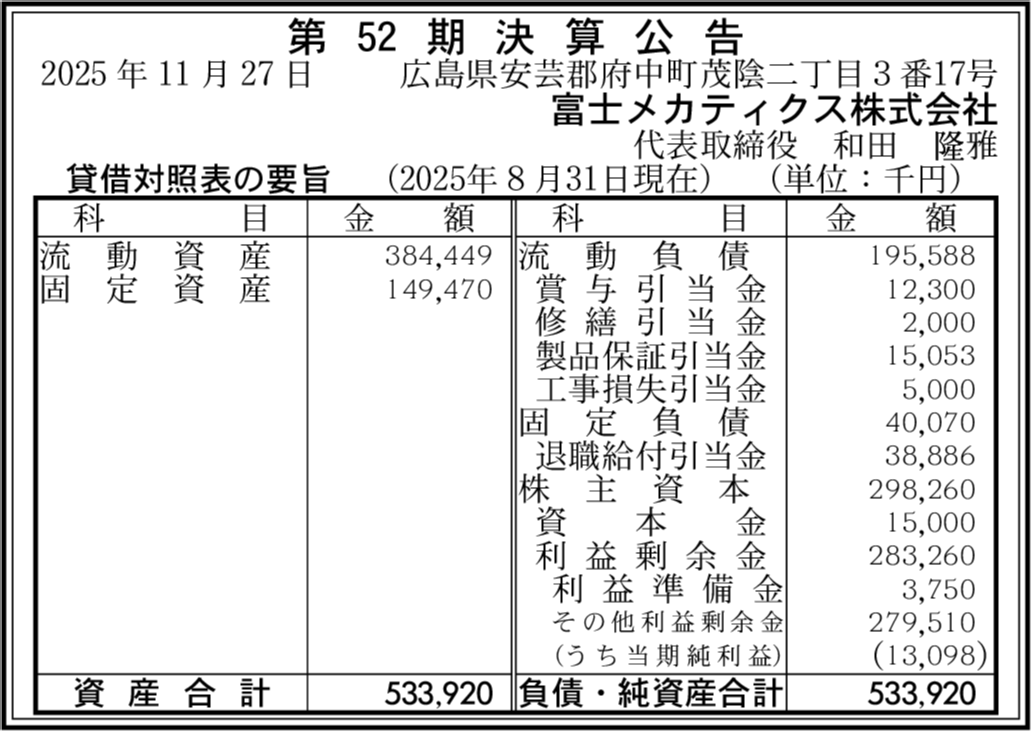 富士機械工業株式会社 広島県安芸郡府中町 【2025年8月期】 |