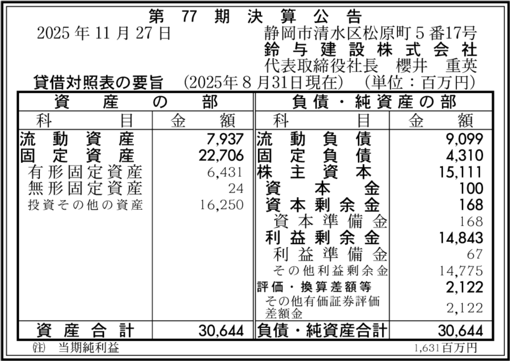 鈴與株式会社 静岡市清水区 【2025年8月期】 |