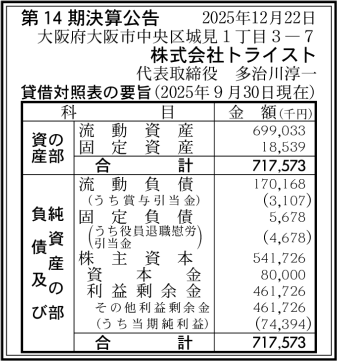 | 利益剰余金 | 4億6,172万6,000円 (+19.21%) |