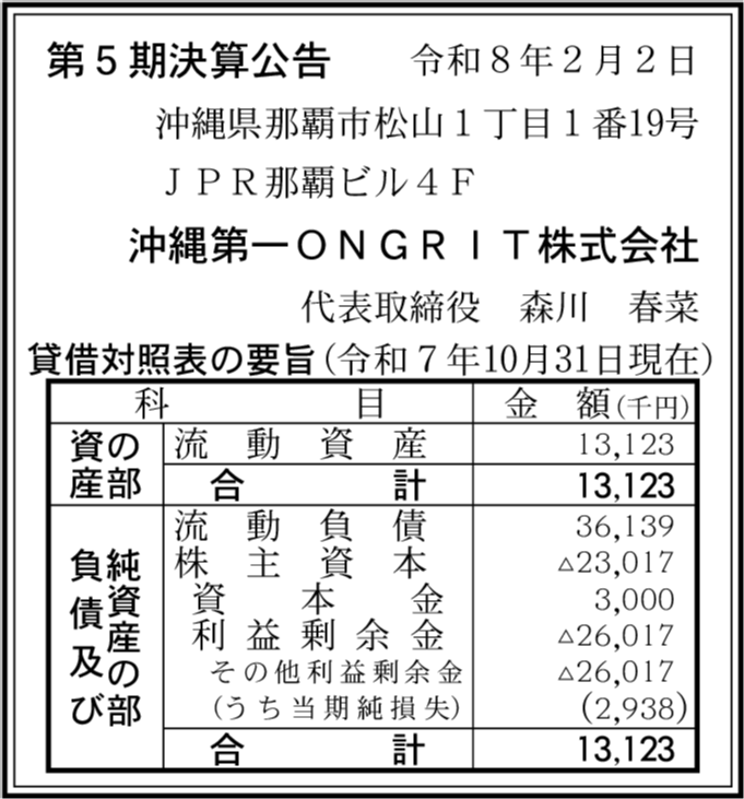 | 会社名 | 沖縄第一ONGRIT株式会社 |