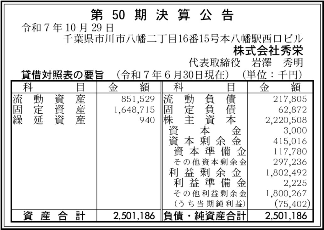 | 会社名 | 株式会社秀栄 |