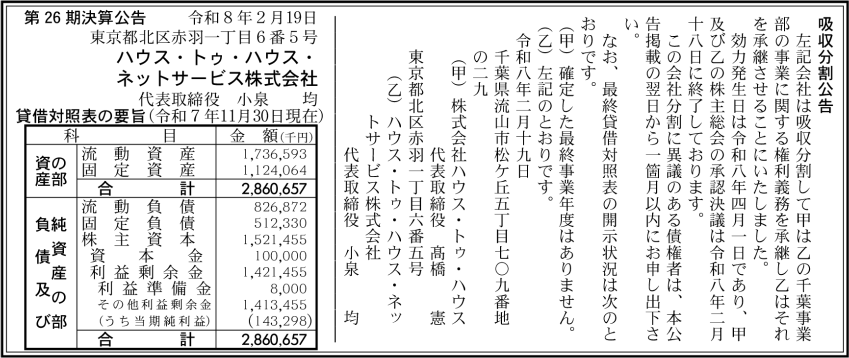 | 会社名 | ハウス・トゥ・ハウス・ネットサービス株式会社 |