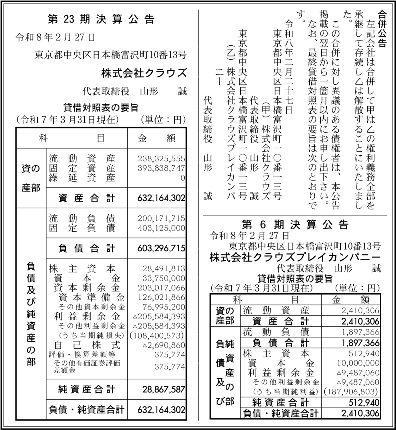 株式会社クラウズ 東京都中央区 【2025年3月期】 |