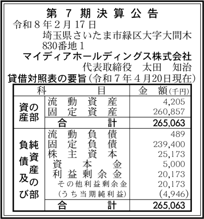 | 会社名 | マイディアホールディングス株式会社 |