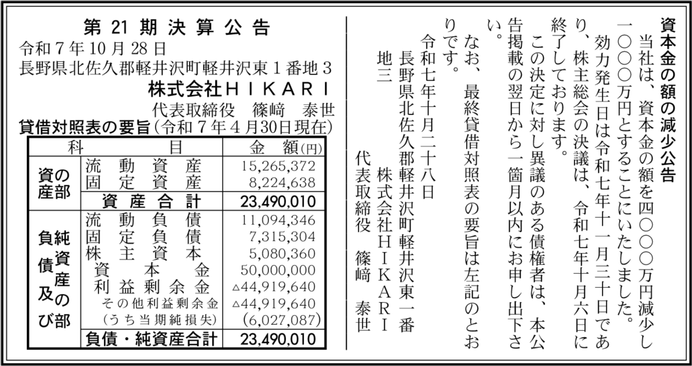 | 株式会社AI 長野県北佐久郡軽井沢町 【2025年3月期】 | △1,337万6,086円 (赤字拡大) | 1億216万9,190円 (▲11.57%) | 1億472万6,010円 (▲12.06%) |