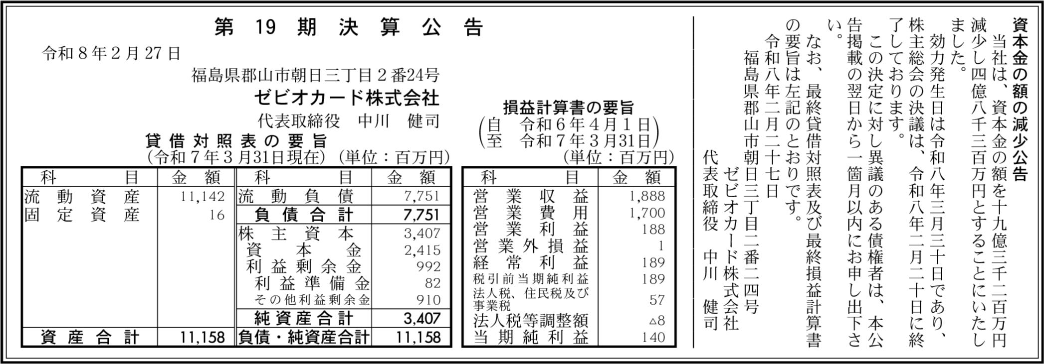| 純利益 | 1億4,000万円 |