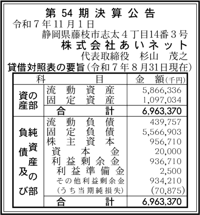 株式会社あいネットサービス 静岡市駿河区 【2025年8月期】 |