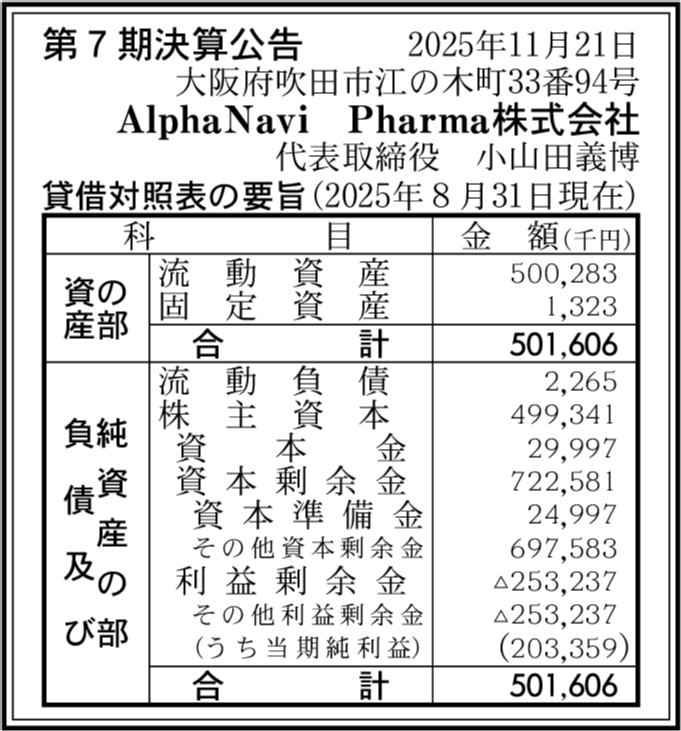 | 会社名 | AlphaNavi Pharma株式会社 |