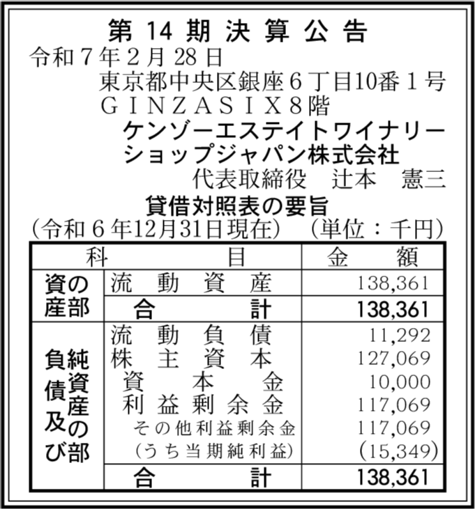 ケンゾーエステイトワイナリージャパン株式会社 東京都中央区 【2024年12月期】 |