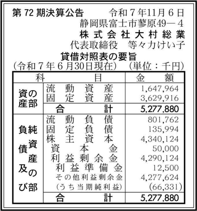 | 総資産 | 52億7,788万円 (▲8.34%) |
