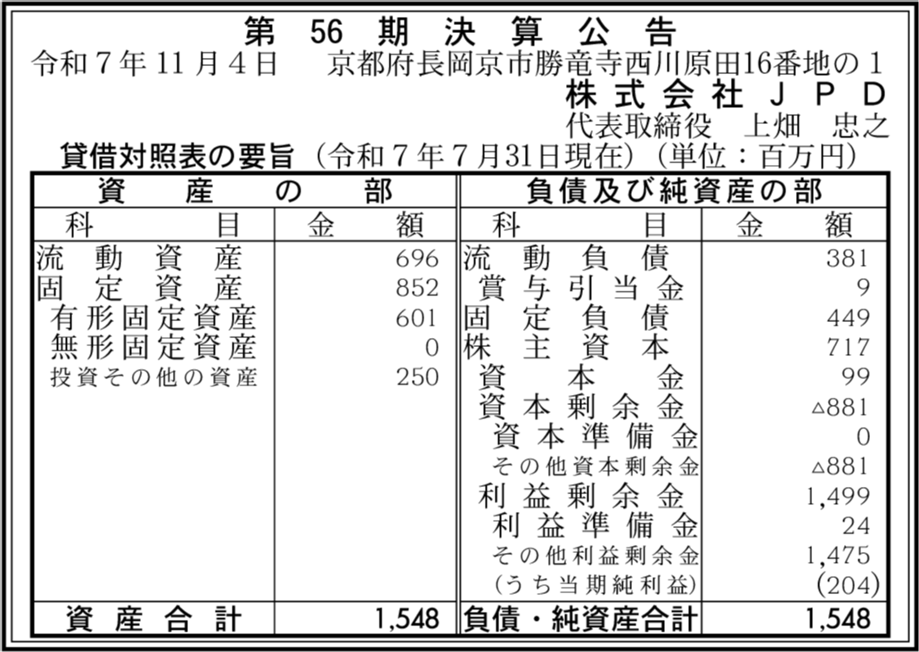 | 株式会社ジェー・ピー・ディー・ホロス準備会社 | 京都市中京区 | ▲600万円 (赤字縮小) |