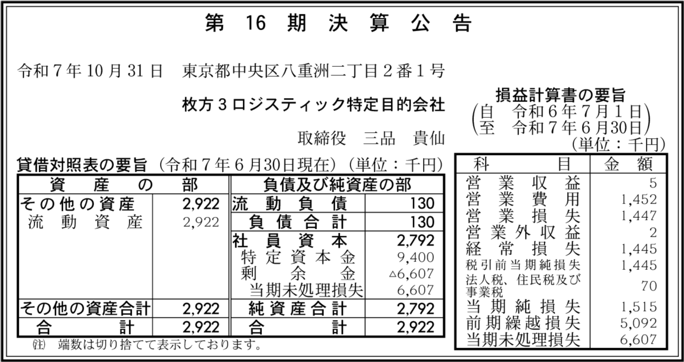三郷3ロジスティック特定目的会社 東京都中央区 【2025年6月期】 |