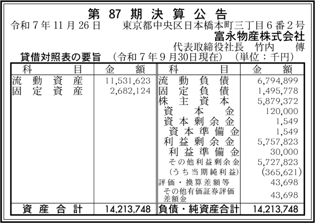 | 総資産 | 142億1,374万8,000円 (▲1.2%) |