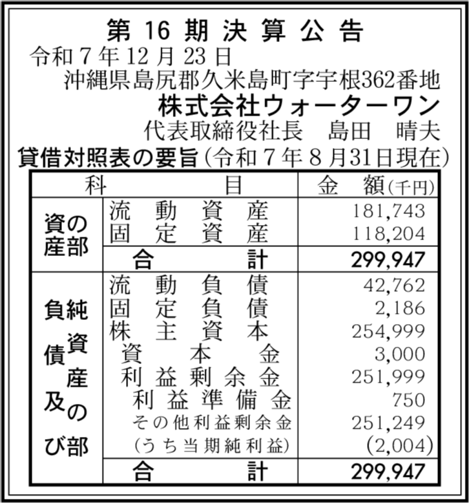 | 利益剰余金 | 2億5,199万9,000円 (▲10.72%) |