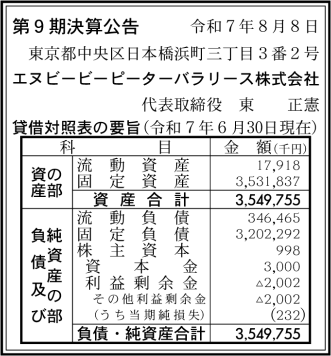 エヌビービーブリストルリース株式会社 東京都中央区 【2025年6月期】 |
