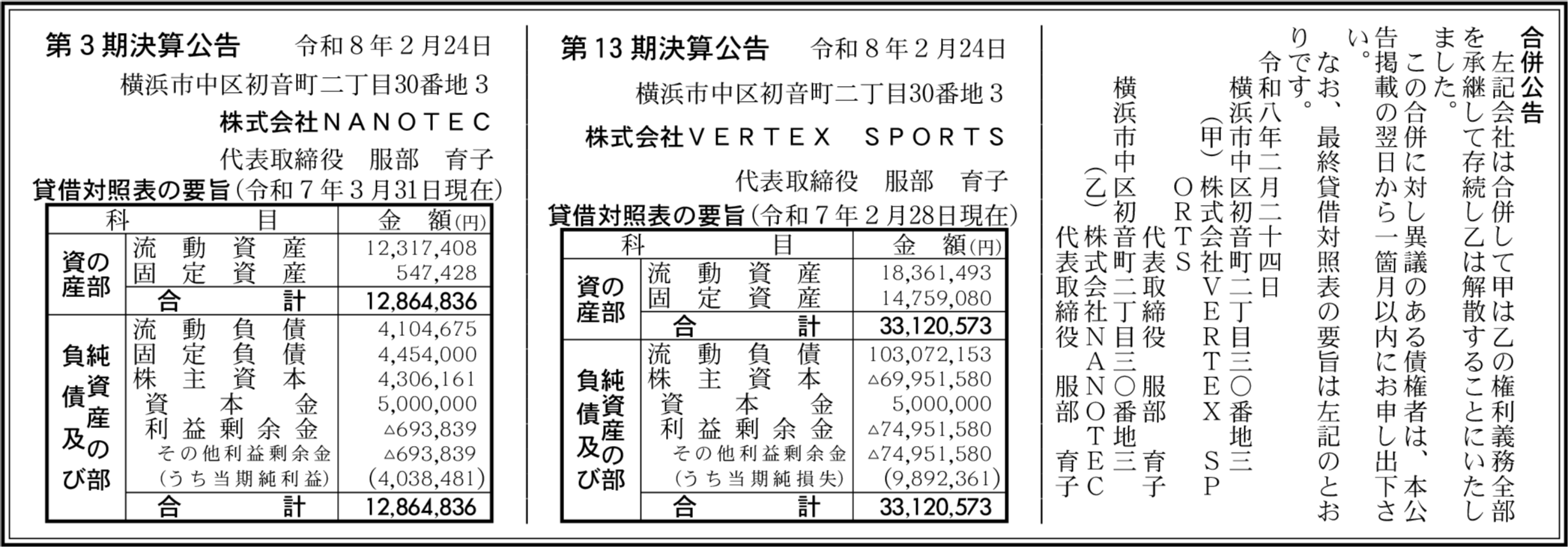 株式会社VERTEX SPORTS 横浜市中区 【2025年2月期】 |