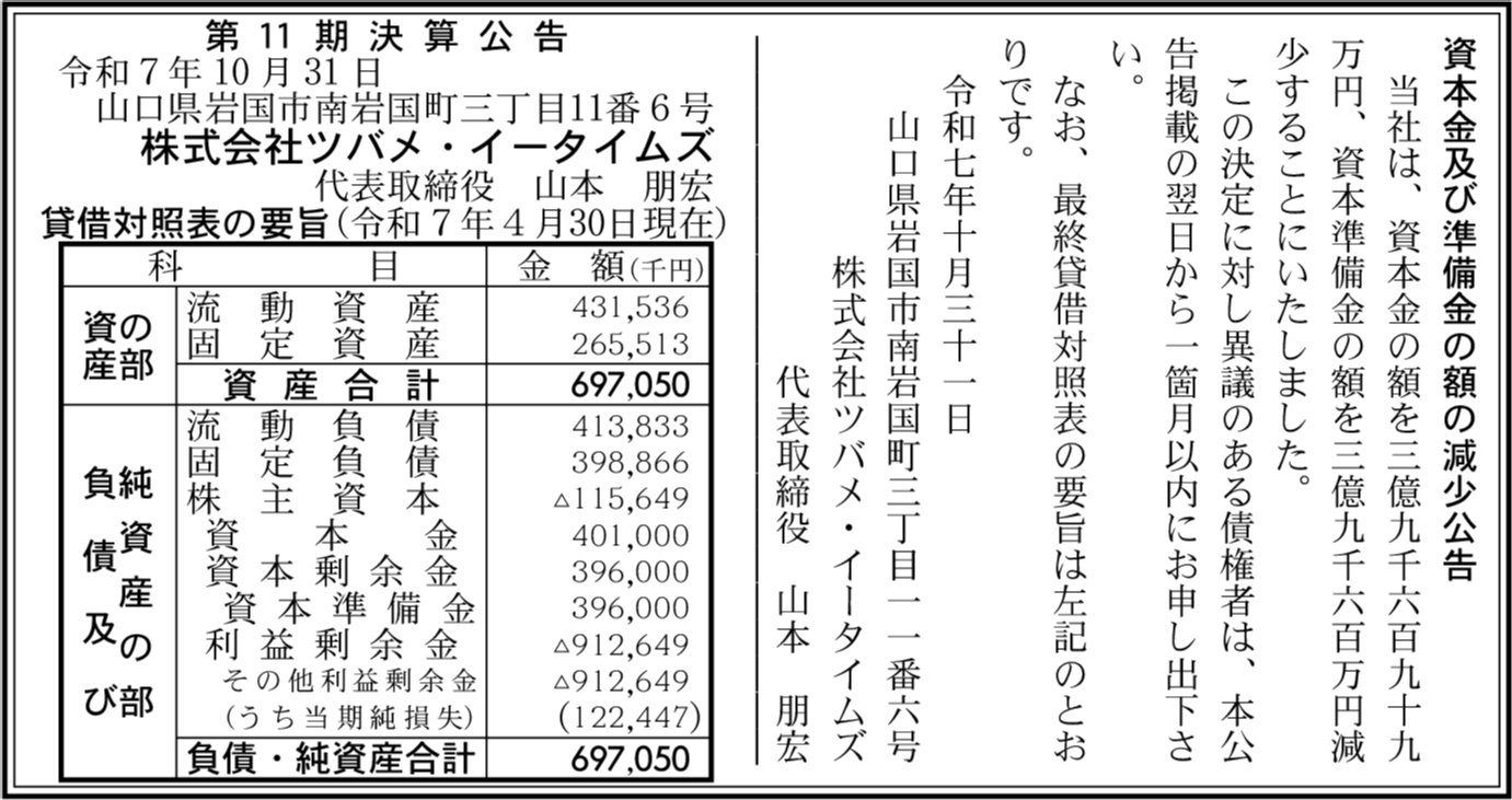 | 会社名 | 株式会社ツバメ・イータイムズ |