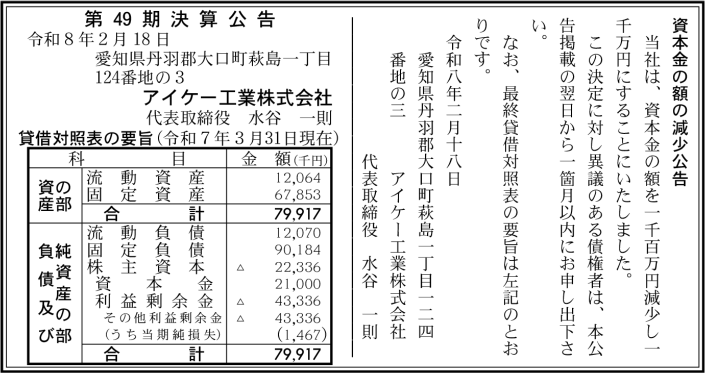 | 会社名 | アイケー工業株式会社 |