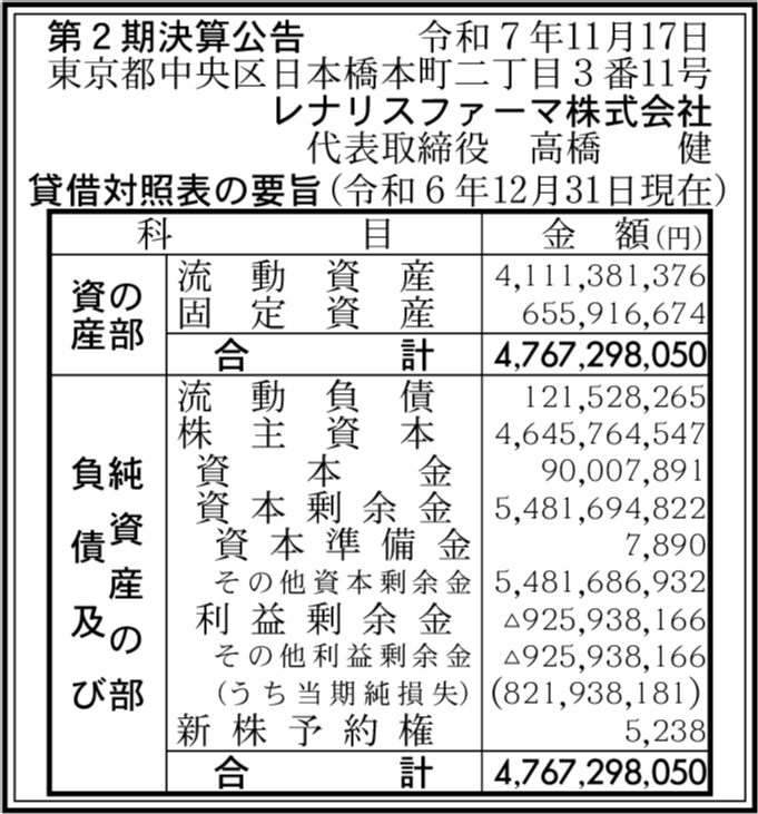 | 利益剰余金 | △9億2,593万8,166円 (赤字拡大) |