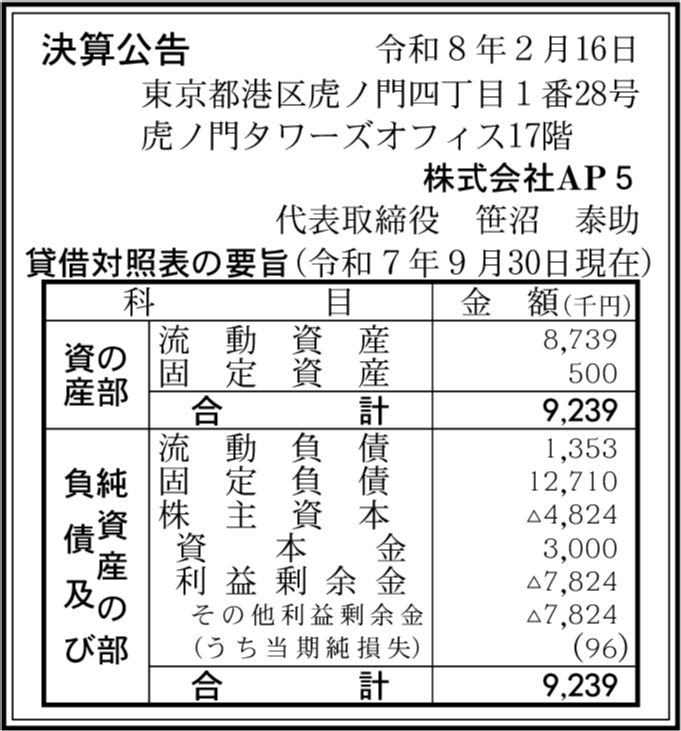 株式会社AP3 東京都港区 【2025年9月期】 |