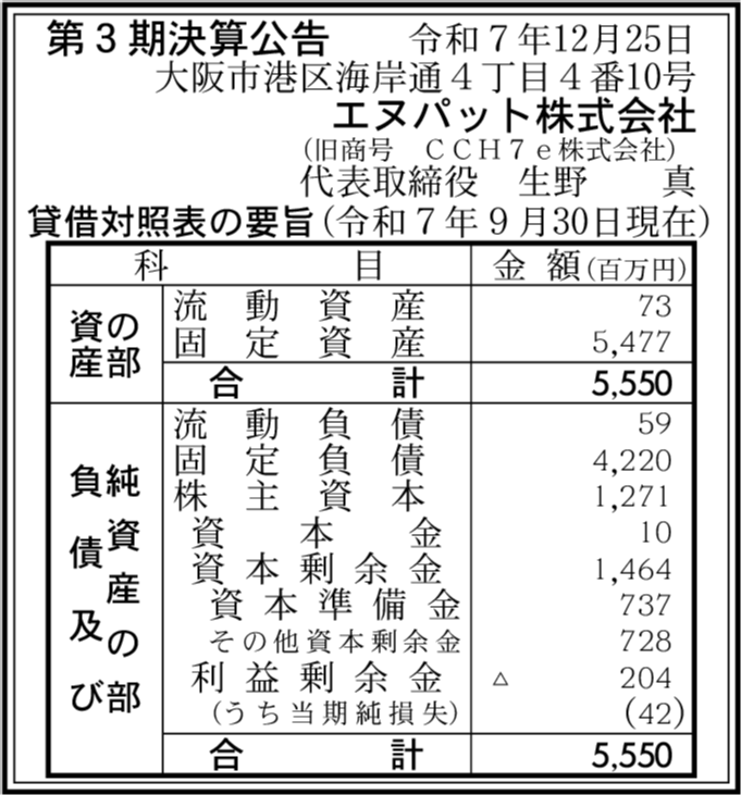 エヌパット株式会社閉鎖済み 大阪市港区 【2024年9月期】 |