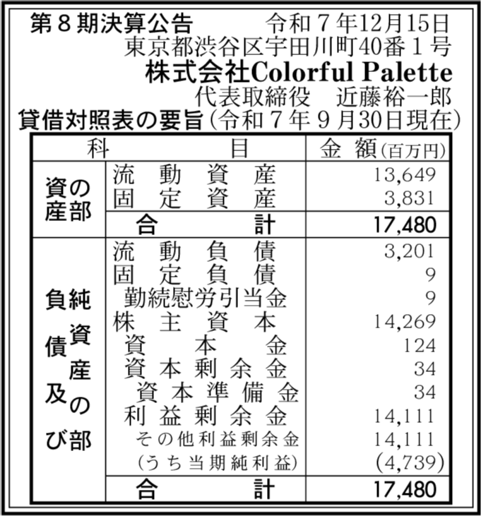株式会社Colorful Palette ENCORE 東京都渋谷区 【2025年9月期】 |