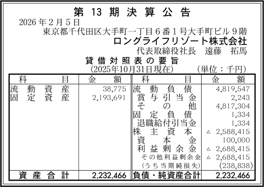 | 親会社・関連会社等 | ロングライフホールディング株式会社(6) |