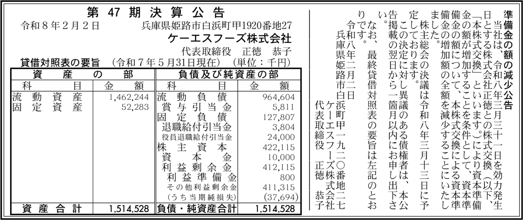 | 会社名 | ケーエスフーズ株式会社 |