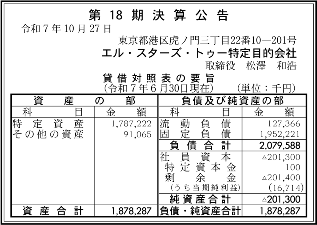 | 会社名 | エル・スターズ・トゥー特定目的会社 |