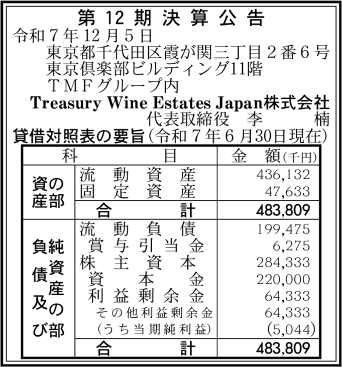 | 会社名 | Treasury Wine Estates Japan株式会社 |