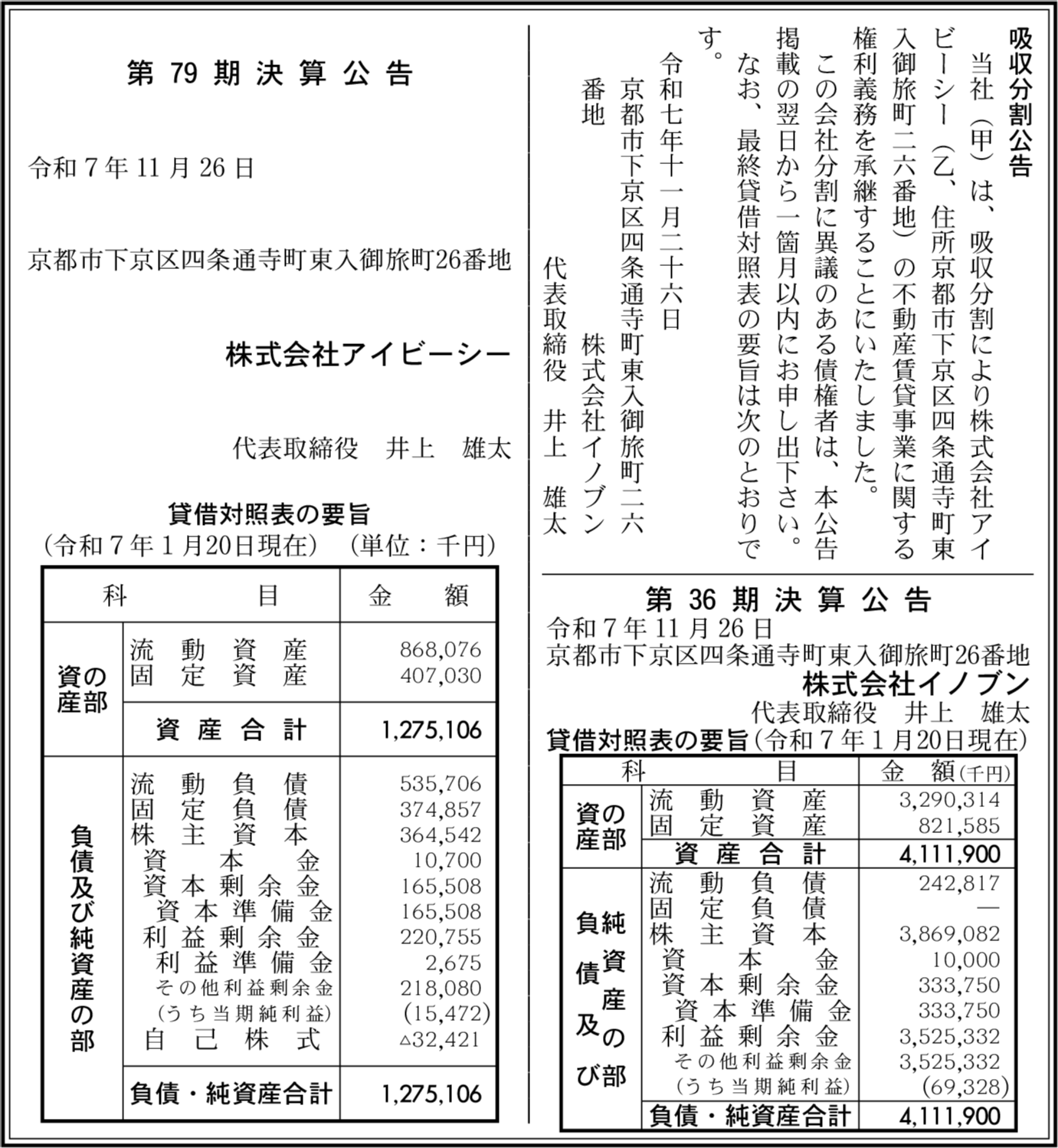 株式会社アイビーシー 京都市下京区 【2025年1月期】 |