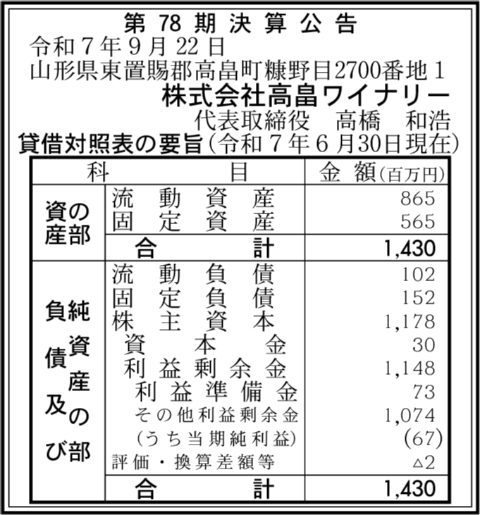 株式会社VinEx高畠閉鎖済み 山形県東置賜郡高畠町 【2023年6月期】 |