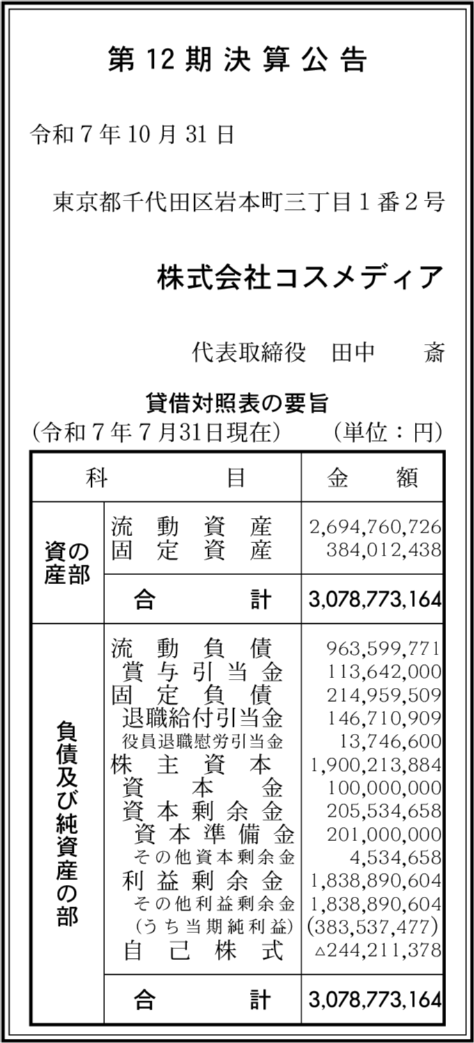 | 純利益 | 3億8,353万7,477円 (+12018.09%) |
