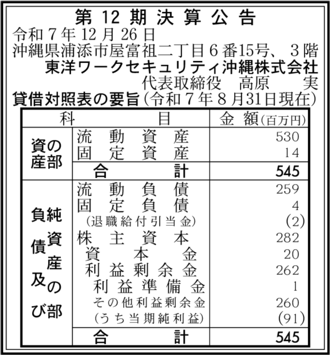 | 会社名 | 東洋ワークセキュリティ沖縄株式会社 |