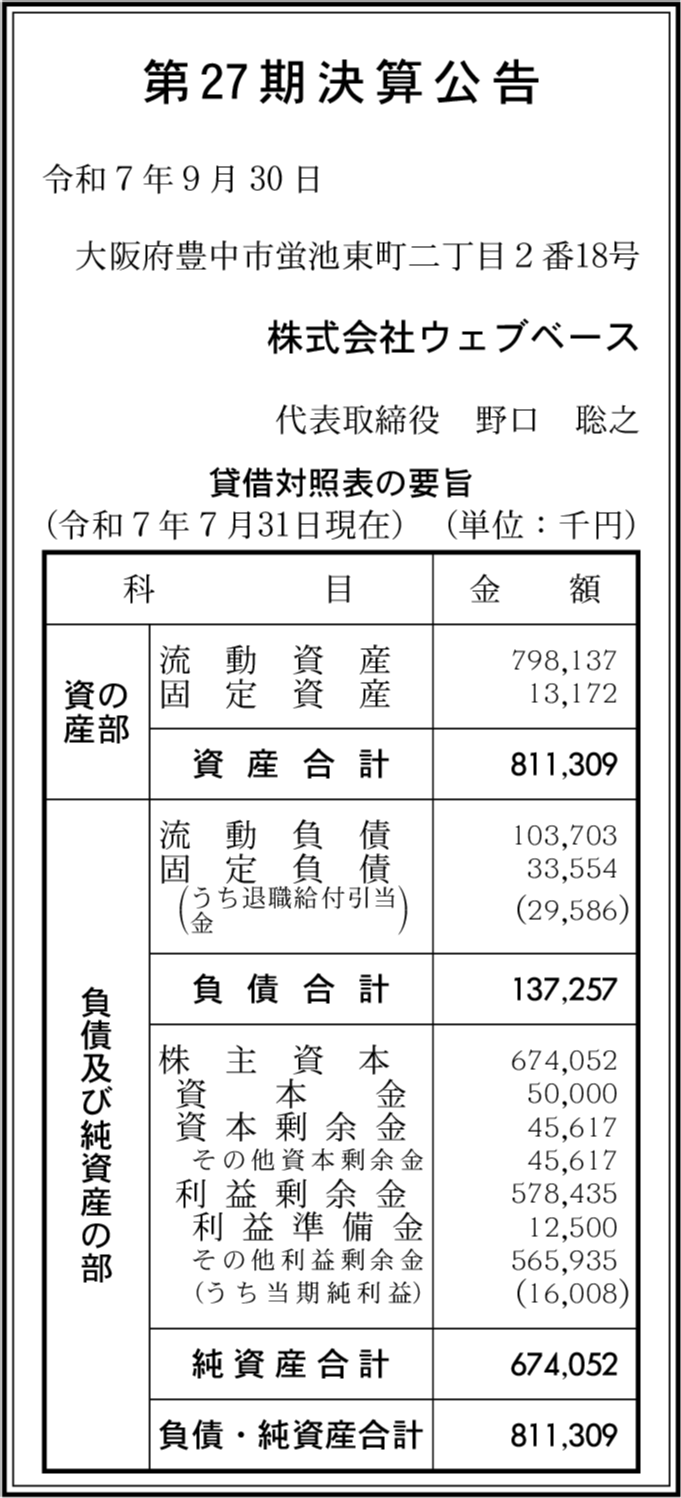 純資産 | 6億7,405万2,000円 (▲0.3%) |