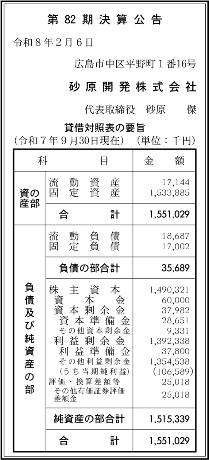 株式会社砂原組 広島市中区 【2025年9月期】 |