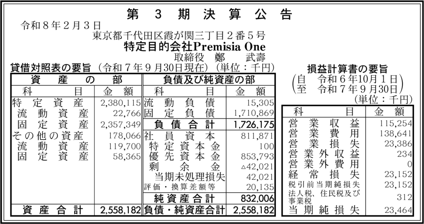 | 会社名 | 特定目的会社Premisia One |