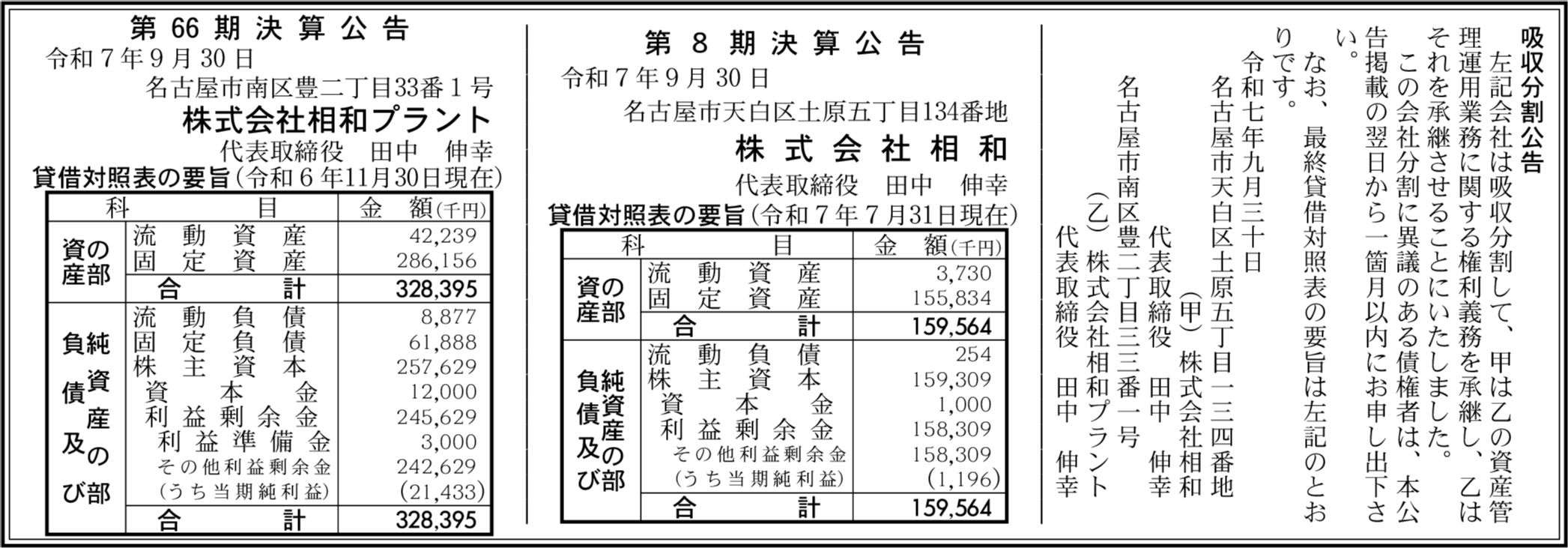 株式会社相和 名古屋市天白区 【2025年7月期】 |