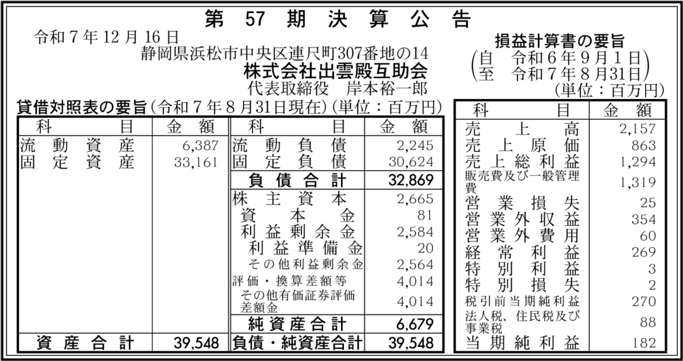 株式会社出雲殿互助会 愛知県名古屋市瑞穂区 【2025年8月期】 |