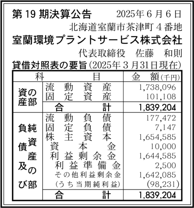 室蘭新エネ開発株式会社 北海道室蘭市 【2025年3月期】 |