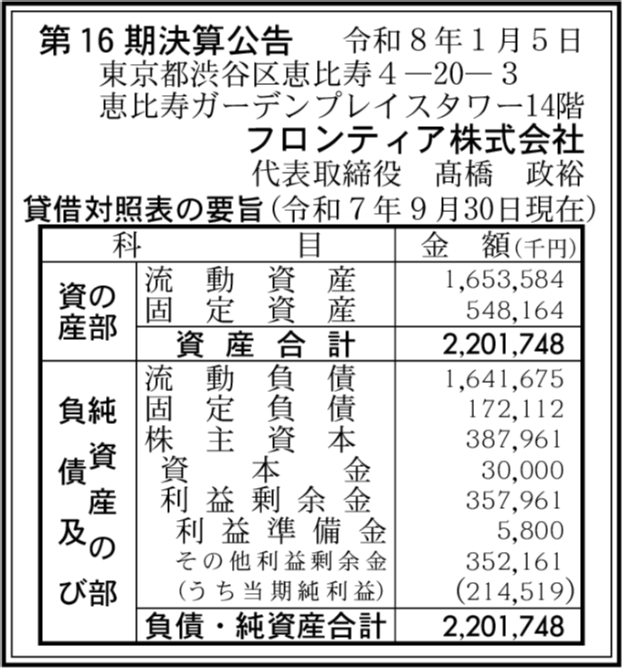 | 会社名 | フロンティア株式会社 |
