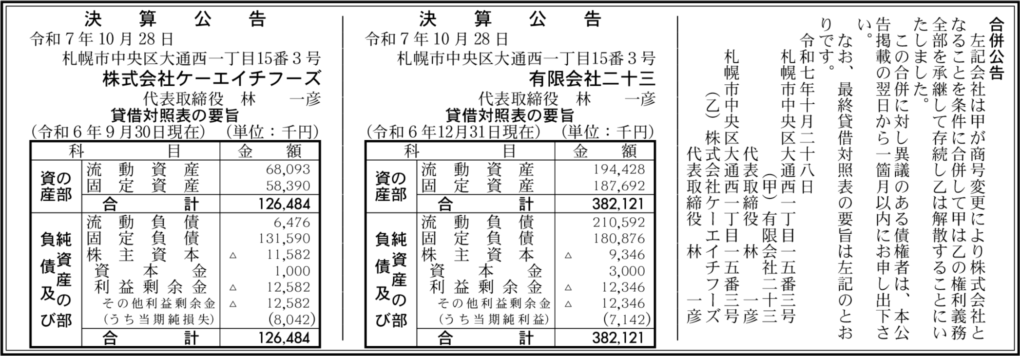 株式会社ケーエイチフーズ 札幌市中央区 【2024年9月期】 |