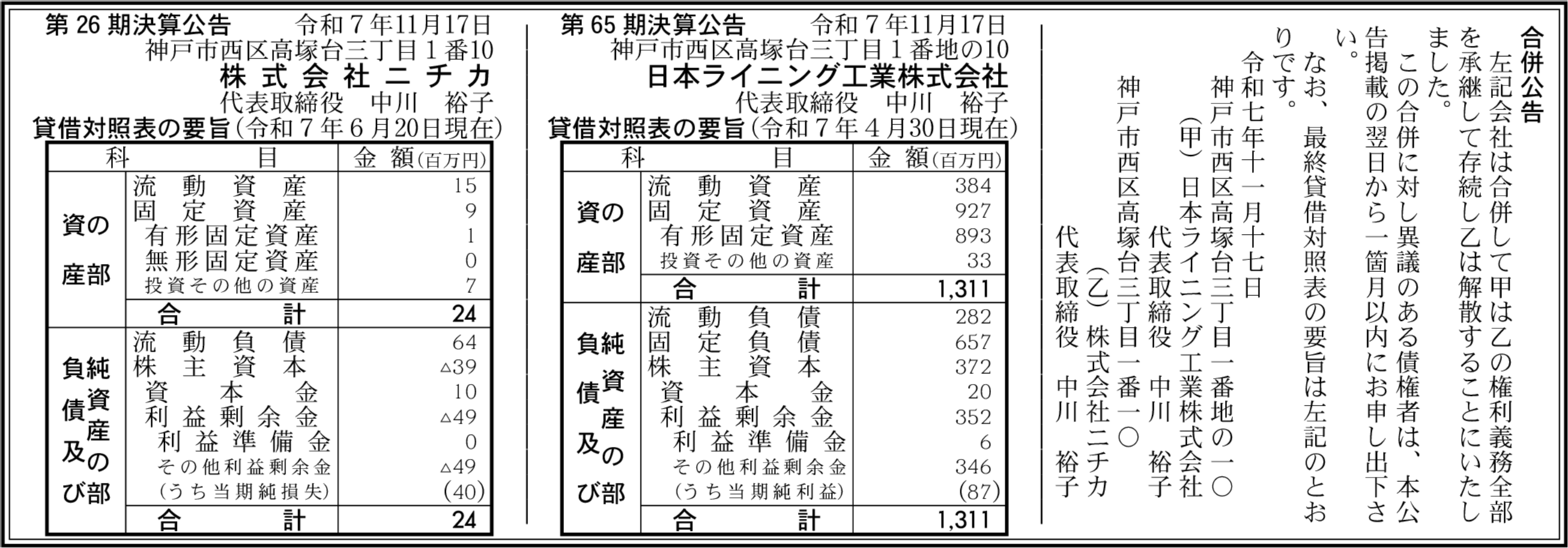 株式会社ニチカ 神戸市西区 【2025年6月期】 |