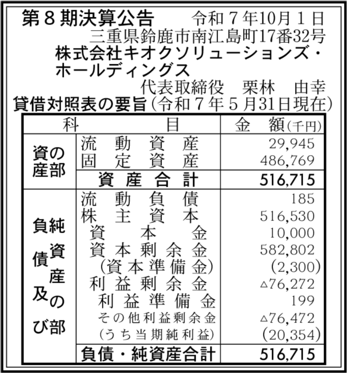 株式会社TKLホールディングス閉鎖済み 三重県鈴鹿市 【2019年5月期】 |