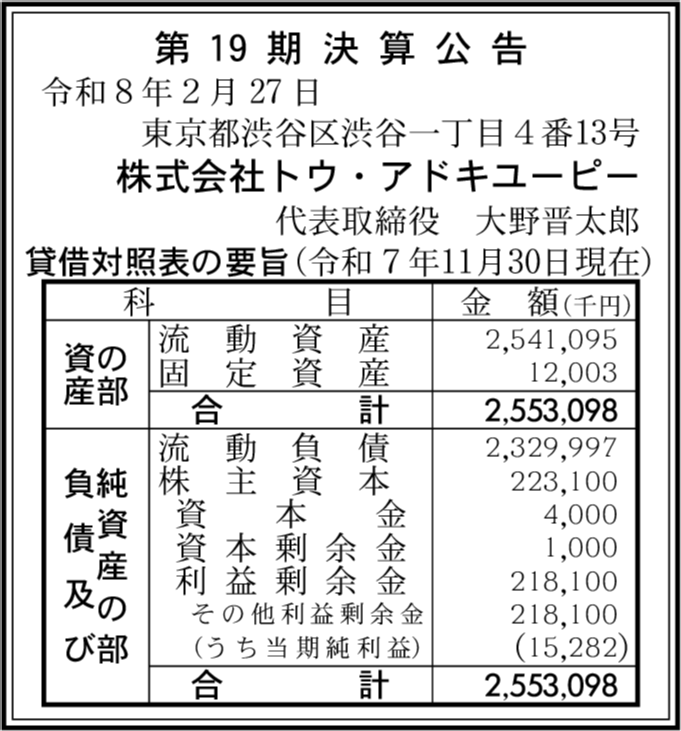 | 会社名 | 株式会社トウ・アドキユーピー |