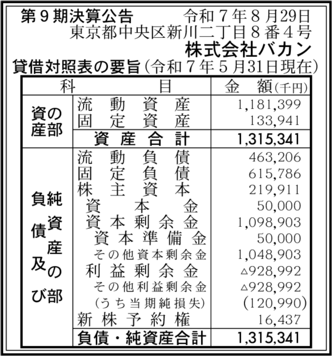 利益剰余金 | △9億2,899万2,000円 (赤字拡大) |