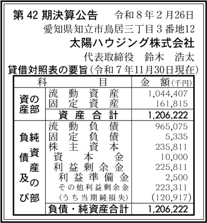 | 会社名 | 太陽ハウジング株式会社 |