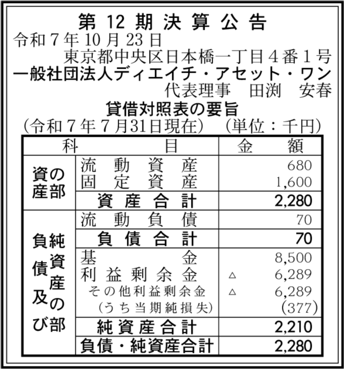 | 会社名 | 一般社団法人ディエイチ・アセット・ワン |