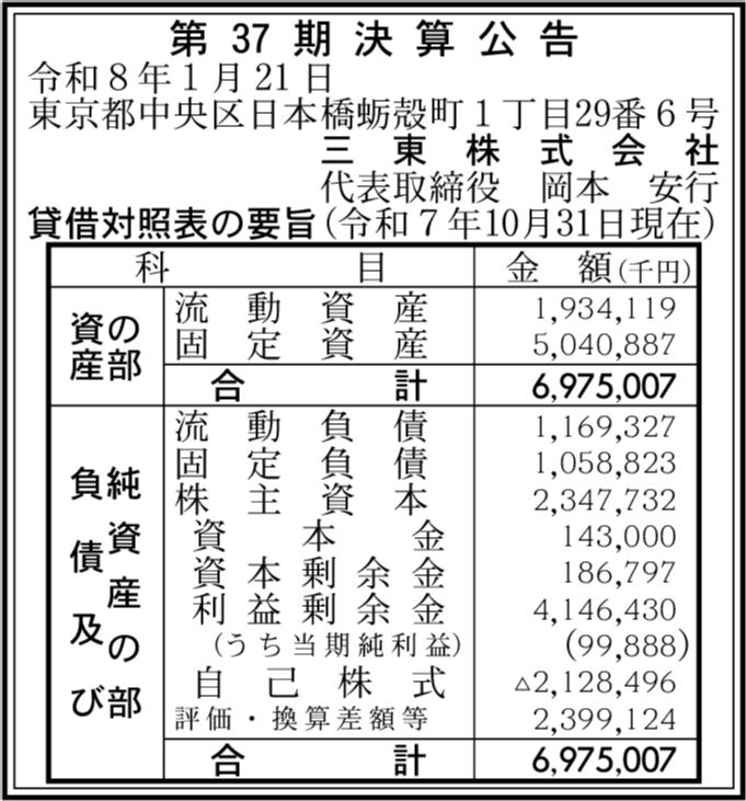 | 総資産 | 69億7,500万7,000円 (+6.13%) |
